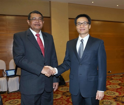 | Le vice-Premier ministre vietnamien Vu Duc Dam (droite) et le vice-Premier ministre et président du Comité national de prévention et de lutte contre la drogue du Cambodge, Ke Kim Yan, le 19 avril à Hanoï. |