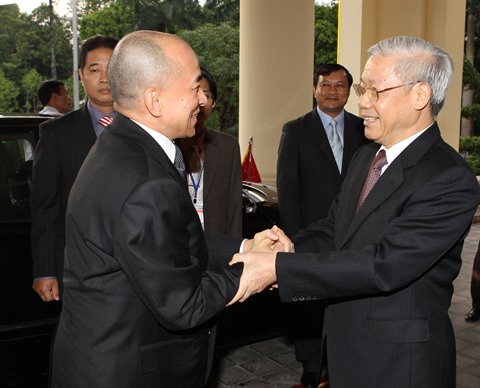 | Le secrétaire général du PCV Nguyên Phu Trong (droite) et le roi du Cambodge Preah Bat Samdech Preah Boromneath Norodom Sihamoni, à Hanoi en 2012. |
