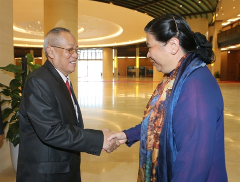 | La vice-présidente permanente de l’Assemblée nationale du Vietnam, Tong Thi Phong, et le premier vice-président du Sénat du Cambodge, Nay Pena, le 9 août à, le 9 août à Hanoï. |