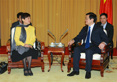 | Le président du Vietnam, Truong Tân Sang, et la présidente de l'Association du Peuple chinois pour l'Amitié avec l'étranger (APCAE), Li Xiaolin, 15 janvier à Hanoi. |
