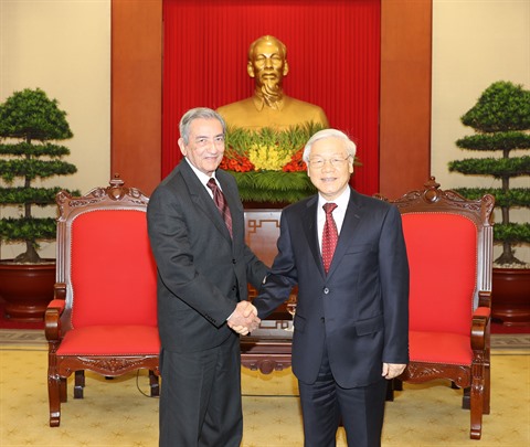 | Le secrétaire général du PC vietnamien, Nguyên Phu Trong (droite) et le secrétaire du Comité central du Parti communiste de Cuba (PCC), président de la commission centrale des relations internationales, José Ramon Balaguer Cabrera, le 24 mai à Hanoï. |