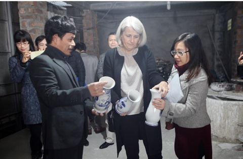 | L’ambassadeur du Danemark, Mme Charlotte Laursen (centre), visite le village de céramique de Kim Lan, le 24 février à Hanoi. |