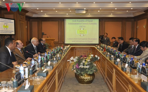 | Séance de travail, le 4 avril au Caire, entre la délégation vienamienne d'inspecteurs et l’Autorité de contrôle administrative de l’Égypte. |