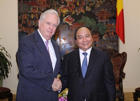 | Le vice-Premier ministre Nguyên Xuân Phuc (droite) reçoit le professeur Thomas Vallely, conseiller du programme du Vietnam de l'Université de Harvard, le 31 mars à Hanoi. |