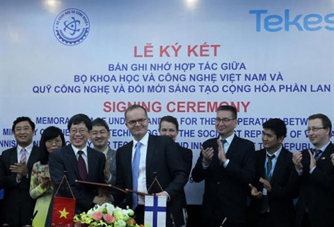 | La cérémonie de signature d'un protocole d'accord de renforcement de leur coopération, notamment dans les sciences et les technologies entre le Vietnam et la Finlande, le 8 mars à Hanoi. |