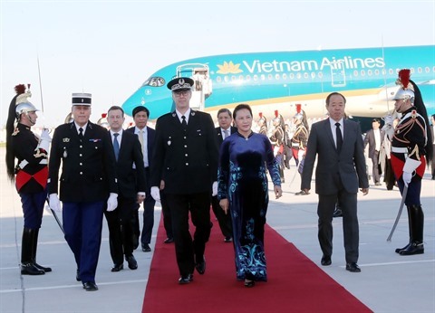 | Cérémonie d’accueil de la présidente de l’Assemblée nationale vietnamienne Nguyên Thi Kim Ngân à l’aéroport Orly, le 30 mars à Paris. |