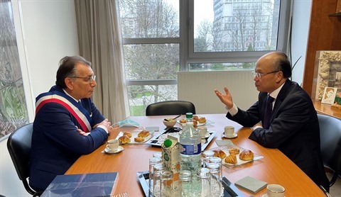 | Le maire Tonino Panetta (gauche) accueille l'ambassadeur du Vietnam en France, Dinh Toàn Thang, à la mairie de Choisy-le-Roi, le 17 février. |