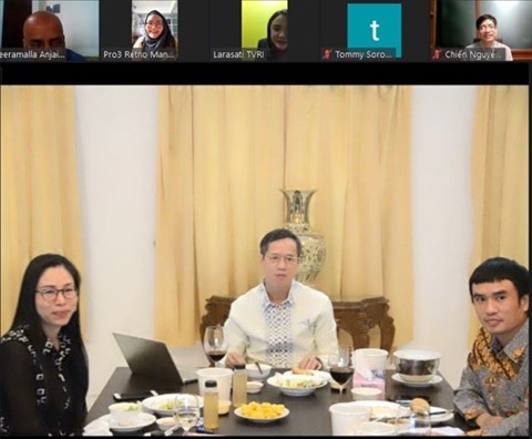| L'ambassadeur du Vietnam en Indonésie, Pham Vinh Quang (au milieu), s'exprime lors de la rencontre par visioconférence. |