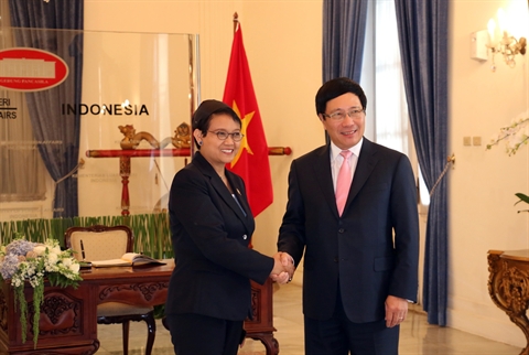 | Le vice-Premier ministre et ministre des Affaires étrangères Pham Binh Minh et la ministre indonésienne des Affaires étrangères Retno Marsudi, le 25 juin à Jakarta. |
