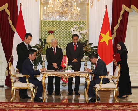 | Le secrétaire général du PCV, Nguyên Phu Trong (aux cheveux blancs) et le président indonésien Joko Widodo assistent à la cérémonie de signature des documents de coopération bilatérale, le 23 août à Jakarta. |
