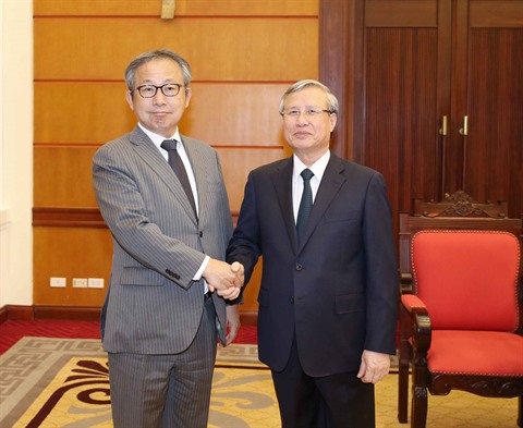 | Trân Quôc Vuong, membre du Politburo et permanent du secrétariat du Comité central du PCV (droite), a reçu le nouvel ambassadeur du Japon au Vietnam Yamada Takio à Hanoi le 8 juillet. |