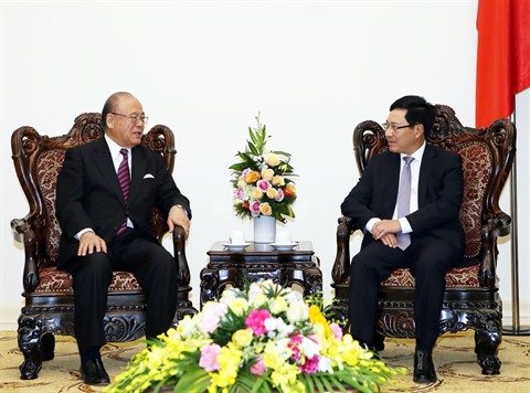 | Le vice-Premier ministre et ministre des Affaires étrangères Pham Binh Minh (droite) et Tsutomu Takebe, conseiller spécial de l’Alliance parlementaire d’amitié Japon-Vietnam. |