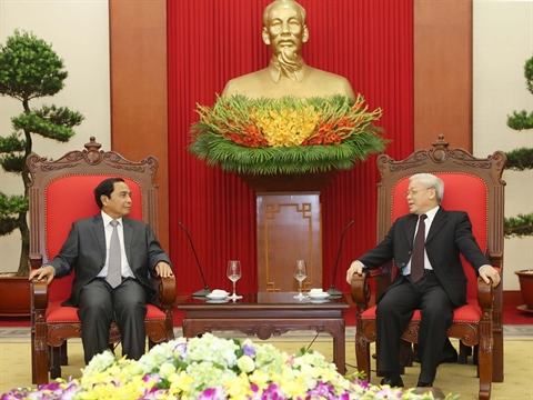| Le secrétaire général du PCV, Nguyên Phu Trong (droite), reçoit Bounthong Chitmany, chef de la Commission de Contrôle du CC du Parti populaire révolutionnaire du Laos, le 25 août à Hanoi. |