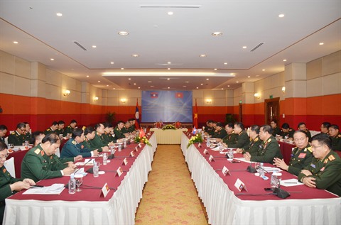 | Vue générale de l'entretien entre la délégation du ministère vietnamien de la Défense et celui du Laos dans le cadre de la conférence des ministres de la Défense, Vietnam - Laos - Cambodge, le 28 décembre à Phnom Penh. |