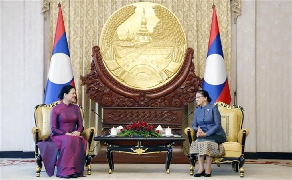| La vice-présidente laotienne Pany Yathotou (droite) reçoit la présidente de l’Union des femmes vietnamiennes, Hà Thi Nga. |
