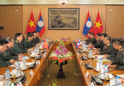 | Entretien entre le ministre vietnamien de la Défense, le général Phùng Quang Thanh, et le général de corps d'armée et ministre lao de la Défense, Sengnoun Saynhalat, le 16 septembre à Hanoi. |