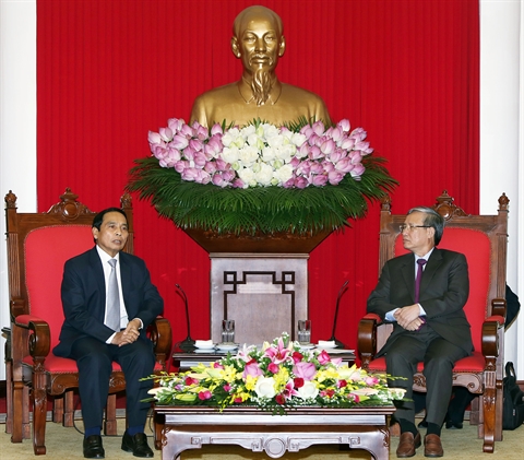 | Le président de la Commission centrale du contrôle du PCV, Trân Quôc Vuong (droite), et le vice-Premier ministre et Inspecteur général du gouvernement lao, Bounthong Chitmany, le 25 juillet à Hanoi. |