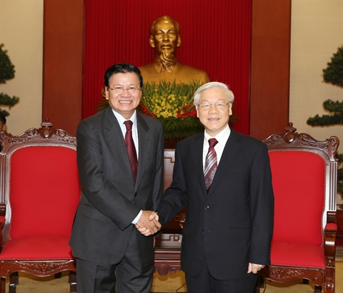 | Le secrétaire général du PCV Nguyên Phu Trong (droite) reçoit le vice-PM et ministre lao des Affaires étrangères, Thongloun Sisoulith, le 4 novembre à Hanoi. |