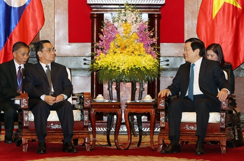 | Le président vietnamien Truong Tân Sang (droite) et le Premier ministre lao, Thongsing Thammavong, le 16 mars à Hanoi. |