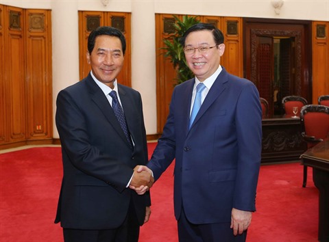 | Le vice-Premier ministre Vuong Dinh Huê (droite) serre la main du vice-président de l’AN du Laos, Bounpone Bouttanavong. |