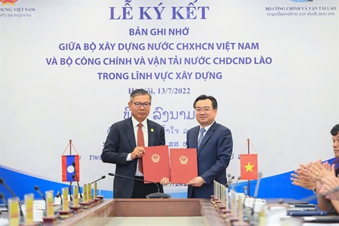 | Le ministre vietnamien de la Construction, Nguyên Thanh Nghi (droite), et le ministre laotien des Travaux publics et du Transport, Viengsavath Siphandone. |