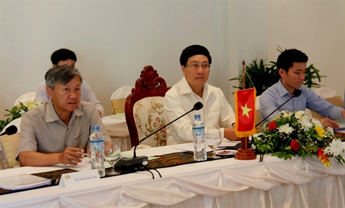 | Le ministre vietnamien des Affaires étrangères Pham Binh Minh (centre) lors de l'entretien avec la délégation diplomatique du Laos. |