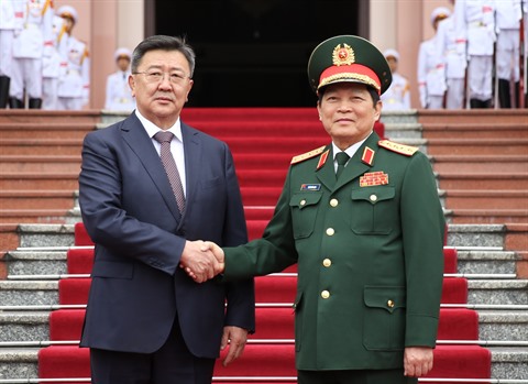 | Le ministre de la Défense, le général Ngô Xuân Lich (droite), et son homologue mongol Enkhbold Nyama. |