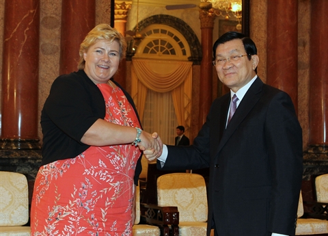 | Le président Truong Tân Sang a reçu la Première ministre norvégienne Erna Solbergvendredi, le 17 avril à Hanoi. |