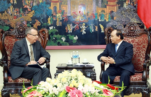 | Le vice-Premier ministre Nguyên Xuân Phuc (droite) lors d'une rencontre le 4 décembre à Hanoi avec Yury Fedotovov, secrétaire général adjoint de l'ONU, directeur général de l'ONU à Vienne et directeur exécutif de l'ONUDC. |