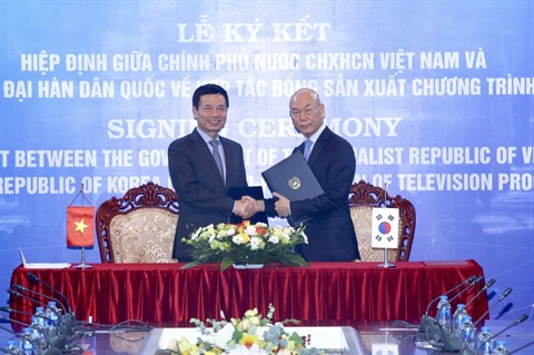 | Le ministre vietnamien de l'Information et de la Communication, Nguyên Manh Hùng (gauche), et le président de la Commission coréenne des communications, Lee Hyo-seong, après la signature de l'accord de coopération sur la coproduction de programmes télévisés |