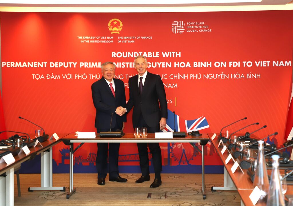 | Le vice-Premier ministre Nguyên Hoà Binh (gauche) et l’ancien Premier ministre britannique Tony Blair, président du Tony Blair Institute for Global Change (TBI). |
