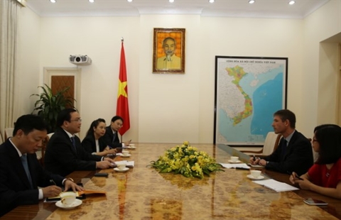 | Le vice-Premier ministre Hoàng Trung Hai (2e à gauche) reçoit l'ambassadeur britannique au Vietnam, Giles Lever (2e à droite), le 21 juillet à Hanoi. |