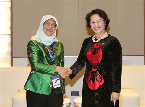 | La présidente de l’AN vietnamienne Nguyên Thi Kim Ngân (droite) et la présidente du Parlement singapourien Halimah Yacob |