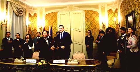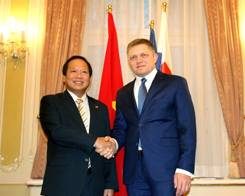 | Le ministre vietnamien de l’Information et de la Communication Truong Minh Tuân et le Premier ministre slovaque Robert Fico. |