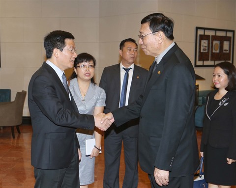 | Le président du groupe de députés d'amitié Vietnam - Thaïlande, Pham Dinh Toàn (gauche) et le président du Conseil législatif national de Thaïlande, Pornpetch Wichitcholchai, le 15 août à Hanoï. |