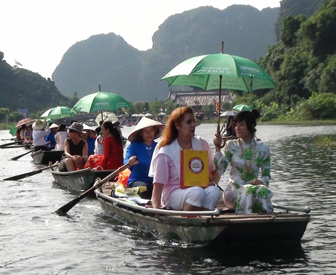 | Des étrangers visitent le site touristique de Tràng An (province de Ninh Binh, Nord). |