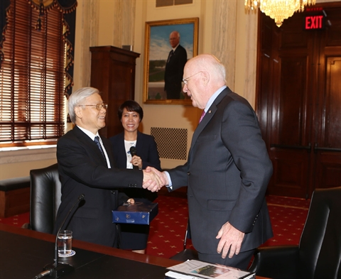 | Le secrétaire général du PCV, Nguyên Phu Trong (gauche) et le président du Sénat, Patrick Leahy. |