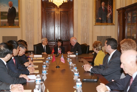 Un grand «bon en avant». Tel est le terme utilisé par Nguyên Phu Trong, secrétaire général du Parti communiste du Vietnam (PCV), pour qualifier les relations entre le Vietnam et les États-Unis. Il l’a fait savoir lors d’une rencontre avec des congressmen, menée par le président du Sénat, Patrick Leahy, à laquelle il a assisté dans le cadre de sa visite aux États-Unis. Les liens bilatéraux entre le Vietnam et les États-Unis se sont développés activement, en se basant sur le respect des principes fondamentaux des relations internationales que sont la compréhension mutuelle, le respect de l'indépendance, de la souveraineté, de l'institution politique, la coopération pour les intérêts communs, le dialogue ouvert afin de parvenir à une conception commune pour les questions sur lesquelles les deux pays ont des différends, a-t-il ajouté.