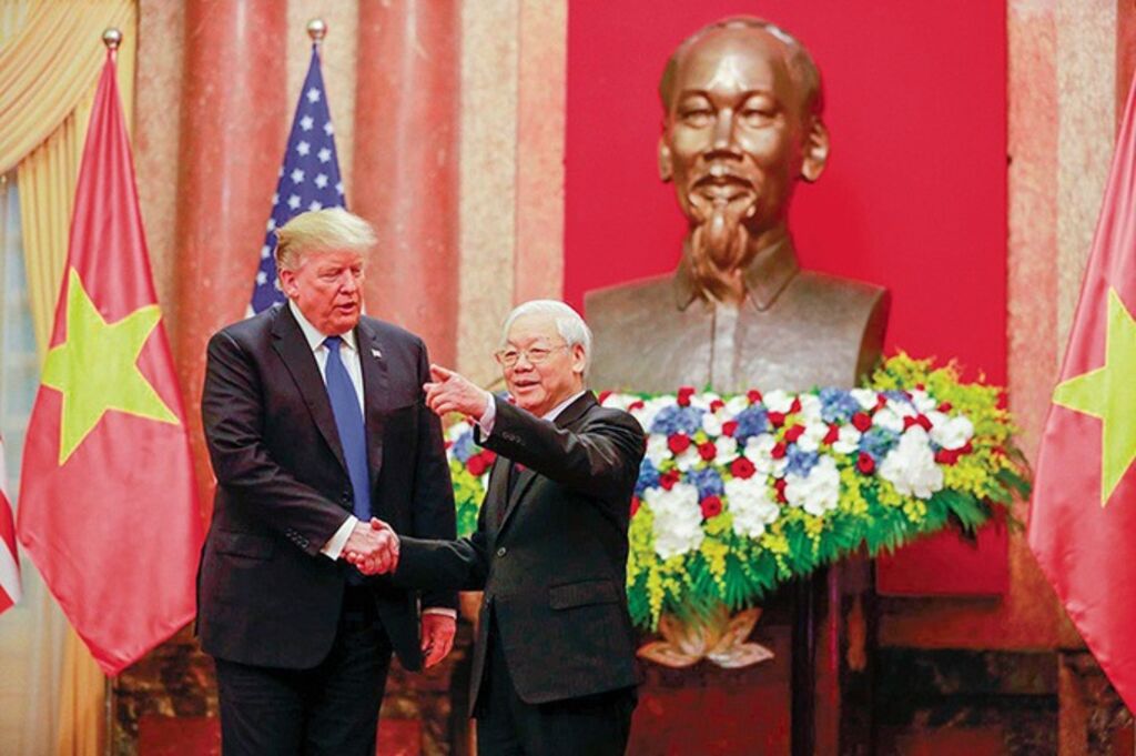 | Le secrétaire général du Parti communiste du Vietnam, Nguyên Phu Trong (gauche), reçoit le président américain Donald Trump lors de son séjour au Vietnam en février 2019. |