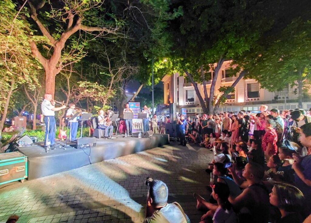 | Un spectacle du groupe musical de l’US Air Force au jardin de fleurs à côté de la rue piétonne autour du lac Hoàn Kiêm, à Hanoï. |