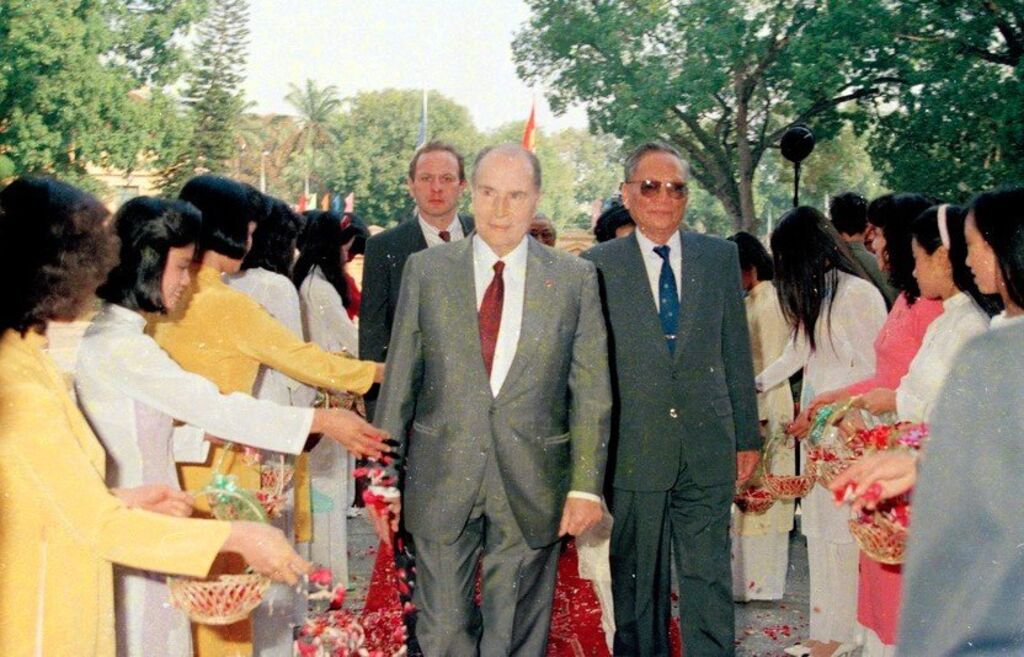 | Le président vietnamien Lê Duc Anh (droite) et son homologue français François Mitterrand lors de sa visite officielle en 1993 à Hanoï. |