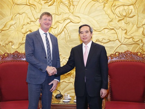 | Le chef de la Commission centrale de l’économie du PCV, Nguyên Van Binh (droite), et le vice-président chargé de la division GNL du groupe Total, Philip Olivier. |