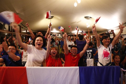 | Des supporteurs de l'équipe de France lors d'une soirée de match organisée à l'ambassade de France à Hanoï. |