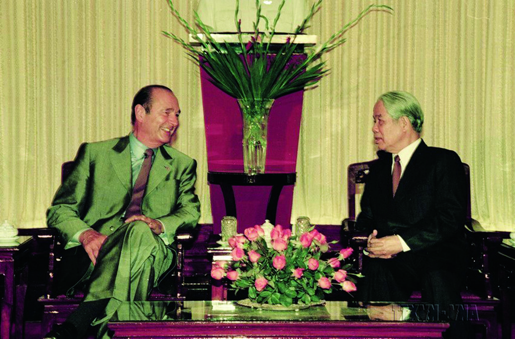 | Le 12 novembre 1997, le secrétaire général du Parti communiste du Vietnam (PCV), Dô Muoi (droite), a reçu le président français Jacques Chirac, en visite officielle au Vietnam, où il a participé au VIIe Sommet de la Francophonie à Hanoï, le premier et unique tenu jusqu'à présent en Asie-Pacifique. |