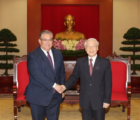 Le secrétaire général du PCV, Nguyên Phu Trong, a eu une rencontre le 11 juillet à Hanoi avec son homologue du KKE, Dimitrios Koutsoumpas, dans le cadre de sa visite de travail au Vietnam du 9 au 15 juillet.