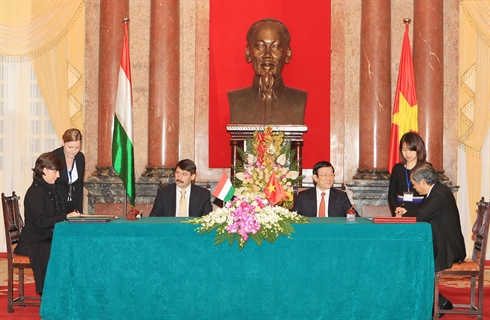 Les deux présidents ont exprimé leur satisfaction devant l’avancée et l’efficacité des relations Vietnam-Hongrie. Ils ont affirmé faire grand cas du développement de l’amitié traditionnelle et de la coopération multilatérale entre les deux pays, et sont convenus de coordonner leurs actions pour organiser en 2015 la célébration du 65e anniversaire de l'établissement de leurs relations diplomatiques avec, entre autres, des expositions photographiques, des semaines cinématographiques, l’échange de délégations artistiques… Malgré la morosité de l'économie mondiale, la coopération économique et au commerce entre le Vietnam et la Hongrie se développe stablement, mais demeure toutefois en-deçà des potentiels comme des souhaits des deux pays, ont-ils estimé.