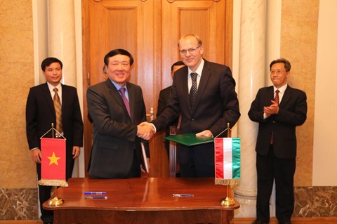 | Le président de la Cour populaire suprême du Vietnam Nguyên Hoà Binh (gauche) et son homologue de la Cour suprême de Hongrie, Peter Darak. |