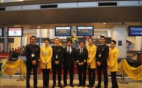 | L'équipage du premier vol de la ligne directe entre Mumbai, New Delhi et Hô Chi Minh-Ville (Vietnam) par la Compagnie aérienne indienne Jet Airways, le 5 novembre en Inde. |