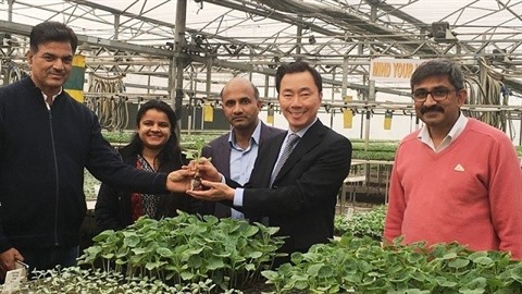 | L’ambassadeur vietnamien en Inde, Pham Sanh Châu (2e à droite), visite un centre de production légumière dans l’Haryana. |