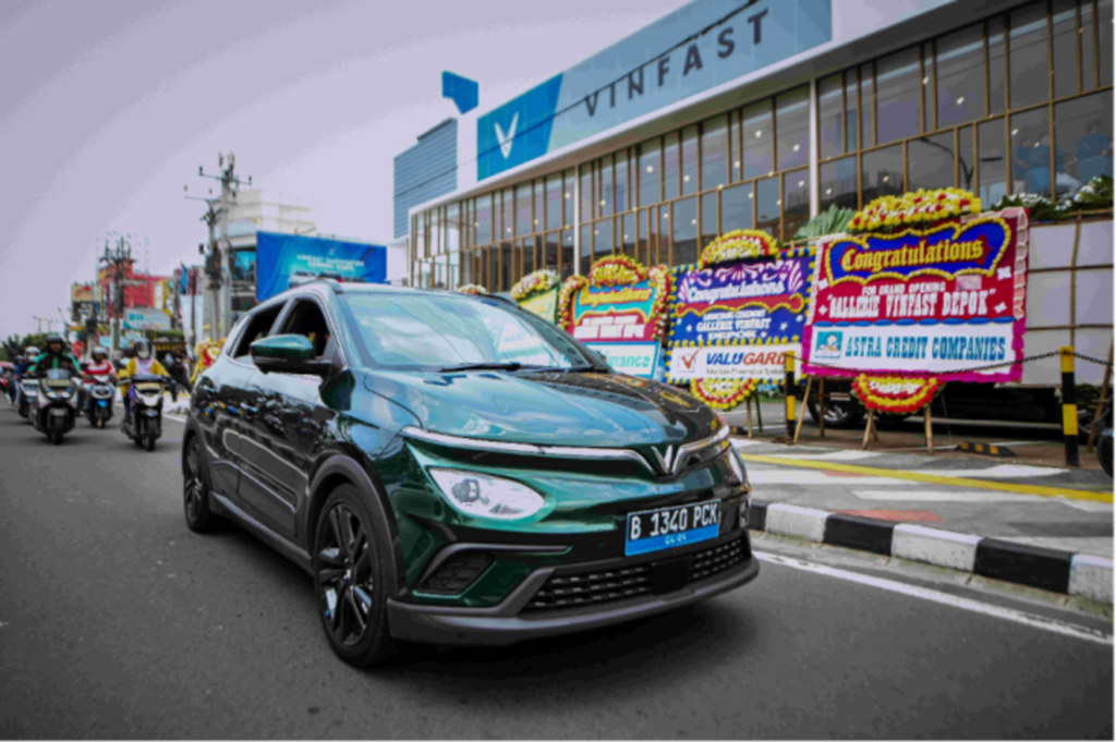 | Un VF e34 devant un showroom du constructeur automobile vietnamien VinFast en Indonésie. |